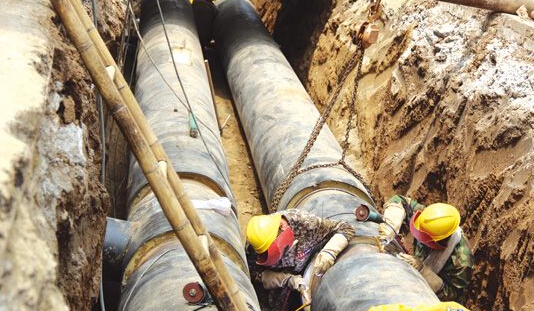 圖為施工人員利用微型手拉葫蘆進行天然氣管道鋪設(shè)作業(yè)集中供熱工...
